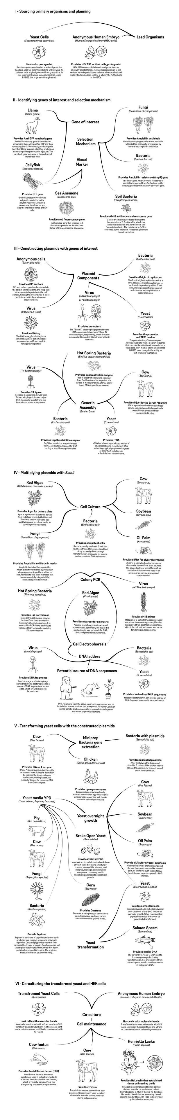 I began by looking into cell line histories and commonly used genes, which are primary and specific skills labourers. It was discovering the organisms behind gene-editing tools, sustenance, and even gene ladders that prompted me to ask more systematically where these abstractly named components come from.